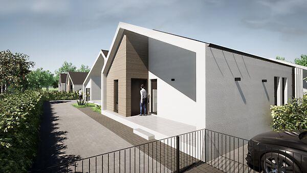 míg az önálló épületek 106 és 150 m2 alapterpletűek, saját 700-900 m2 telken, kocsibeállókkal illetve garázzsal.