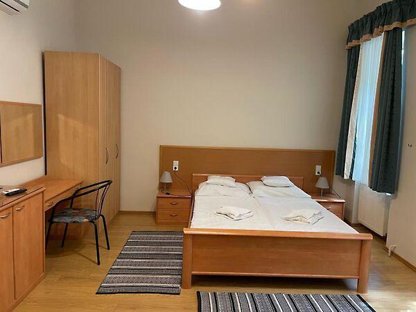 Az épület 94 nm-es telken, zártsorú beépítéssel, téglából épült cserépfedésű sátortetővel. 1993-ban szintráépítéssel készült a II. és III. emelet. A pincében raktár, hűtőkamra, előkészítő helyiség található. A földszinten egy 25 nm-es bérbeadott üzlethelyiség, raktár, recepció, konyha, ffi-női mosdó került kialakításra. Az I., II. és III. emeleten 4 db apartman és 2 db panziószoba helyezkedik el. Minden szoba saját tusolós fürdőszobával, az apartmanok konyhával is rendelkeznek. Az épület fűtését és meleg víz ellátását egy 120 literes meleg víz tárolóval ellátott gázkazán biztosítja, a hőleadók radiátorok. Az apartmanokban és az üzletben a fűtés, illetve a hűtés klímaberendezésekkel is lehetséges. Az apartmanokba laminált parketta, a panziószobákba szőnyegpadló burkolat került. A többi helyiség kerámia burkolattal rendelkezik. A nyílászárók cseréje két ütemben, 10 és 15 éve megtörtént. 3 fázis kiépítésre került. Az üzlethelyiség vendéglátó tevékenységre, reggeliző helyiség kialakítására alkalmas, az utcai terasz bérelhető.