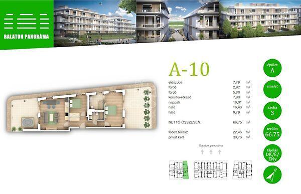 Az épületegyüttes a földfelszín alatt, a pinceszinten (parkoló szinten) egy tömeget képez, mely a földfelszín felett három épületszárnnyá (lépcsőházzá) válik szét. Az épületszárnyak közötti sétányokon burkolt terek és kiemelt kazettákban elhelyezett intenzív zöldtetők kerülnek kialakításra. A Balaton felé néző közös használatú kertrészben pedig egy szintén közös használatú medence is helyet kap.