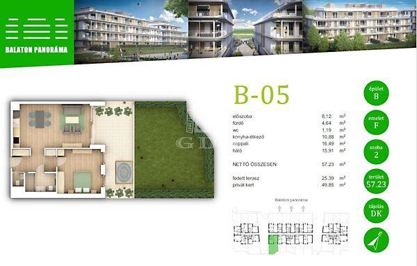 Ez a lakás nappali+1 hálós, 57nm alapterületű+ tartozik hozzá egy 25nm-es fedett terasz és 50nm privát kert is.