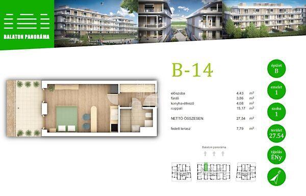 Az épületegyüttes a földfelszín alatt, a pinceszinten (parkoló szinten) egy tömeget képez, mely a földfelszín felett három épületszárnnyá (lépcsőházzá) válik szét. Az épületszárnyak közötti sétányokon burkolt terek és kiemelt kazettákban elhelyezett intenzív zöldtetők kerülnek kialakításra. A Balaton felé néző közös használatú kertrészben pedig egy szintén közös használatú medence is helyet kap.