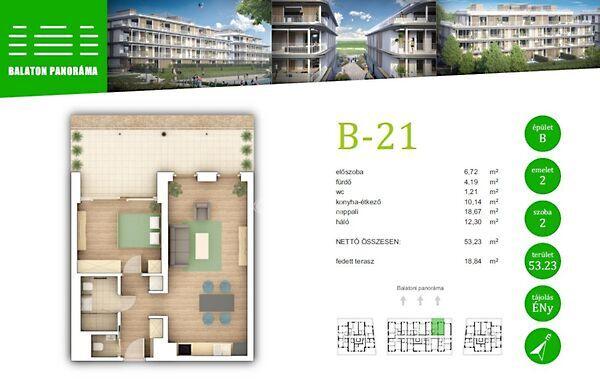 Ez a lakás nappali+1 hálós, 53nm alapterületű+ tartozik hozzá egy 19nm-es fedett terasz is.