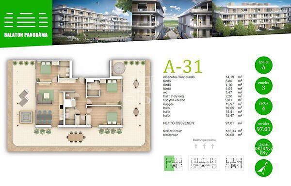 Ez a lakás nappali+3 hálós, 97nm alapterületű+ tartozik hozzá a lakást körülölelő 135nm-es fedett terasz és a tetőszinten található 90nm-es zöld terasz is.