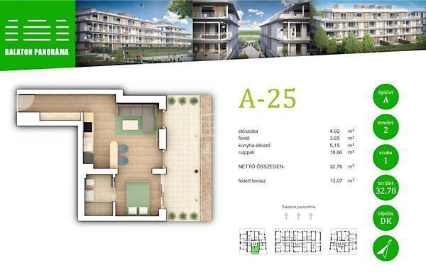 Az épületegyüttes a földfelszín alatt, a pinceszinten (parkoló szinten) egy tömeget képez, mely a földfelszín felett három épületszárnnyá (lépcsőházzá) válik szét. Az épületszárnyak közötti sétányokon burkolt terek és kiemelt kazettákban elhelyezett intenzív zöldtetők kerülnek kialakításra. A Balaton felé néző közös használatú kertrészben pedig egy szintén közös használatú medence is helyet kap.