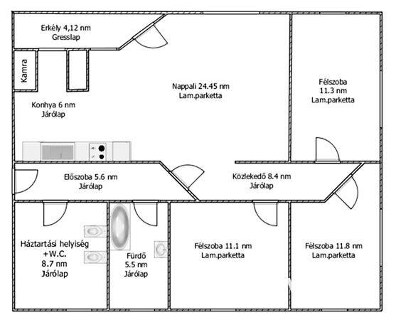 Az ingatlanban 1 szoba (nappali), 3 félszoba, fürdőszoba, külön nyíló W.C., konyha, kamra, közlekedő, előszoba, erkély található.