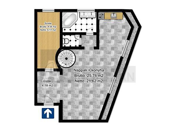 Amerikai konyhás nappali + 1 szoba + galéria. Bruttó: 69,46 m2 Nettó: 40,46 m2 Erkély: 3,67 m2