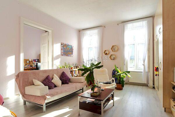 The layout is excellent: living room (28.5 sqm), two separately accessible bedrooms, a kitchen-dining area with windows, bathroom with hydromassage bathtub and separate shower, separate toilet, and pantry. Flooring is tile and laminate parquet. With its southern-eastern orientation and large windows, the apartment is flooded with natural light throughout the day. The 3.7-meter ceiling height, original interior doors, and shutters provide a classic bourgeois atmosphere. All rooms have windows, air conditioning is prepared, with gas boiler and underfloor heating.