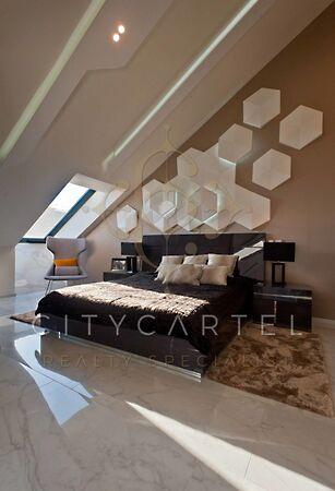 Az egyedi belsőépítészeti megoldások és a gondosan kiválasztott prémium anyagok harmonikus elegyet alkotnak. A LED világítással kombinált faldekorációk és a kézzel készített gipsz mennyezeti díszítések különleges atmoszférát teremtenek. A lakás enteriőrjét olyan neves dizájnmárkák inspirálták, mint a Kare, Bo Concept és Einholtz.