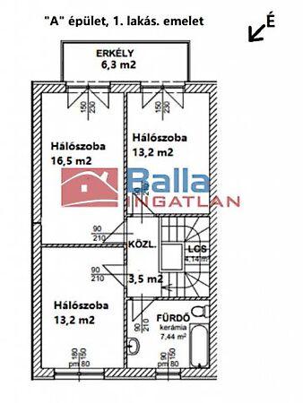 Az emeletre három, külön bejáratú hálószobát és egy Wc-vel is ellátott, kádas fürdőszobát találunk. Az emelet Nem tetőtéri kialakítású, hanem teljes értékű! E szint felett még egy tekintélyes méretű, tárolásra alkalmas padlást találunk; a tetőt modern betoncseréppel van fedve, a födém kőzetgyapot szigeteléssel rendelkezik.