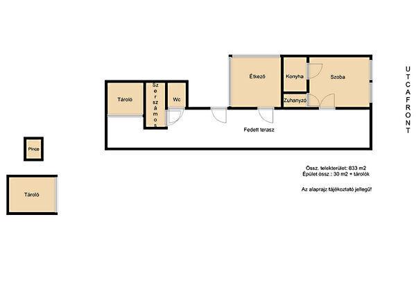 A telken található épület, beton alapon álló zártszelvény vázas, szigetelt faház. Vezetékes víz, villany a házban, gázcsatlakozási lehetőség az utcában, valamint kábeltévé és internet is elérhető. A ház konyhával és zuhanyzóval rendelkezik, külön helyiségben vízöblítéses wc van, de jelenleg fűtés hiányában állandó lakás céljára nem alkalmas. A fő épületet, katonás rendben, felcímkézett dobozokkal bepakolt tárolók és szerszámos helyiség egészíti ki, valamint egy betonozott falú pince és szintén betonozott falú komposztáló.