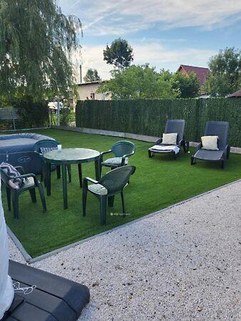 A telek magasabban húzódó hátsó udvarrészén áll egy 45 m2 alapterületű, fedett, fa vázas terasz, mely alatt egy 15 m2 hasznos alapterületű, fémszerkezetű, lakókocsiból készült mobil épület áll. Az ingatlan elektromos áram ellátása 1x16A Vezetékes ivóvíz és gáz közművek közvetlen a telek előtt az utcán elérhetők. A mobil nyaralóház vízellátását fúrt kút, míg a kert locsolását ásott kút vize biztosítja.