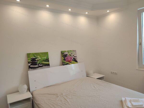 Alsó szinten található 2 szobás külön bejáratú lakóegység, infraszaunával, valamint 51 m²-es fedett beépített terasz, egy tágas étkező, konyha, tároló, mosószoba, lépcsőfeljáró, kazánház és egy 2 szobás fürdőszobás lakórész.