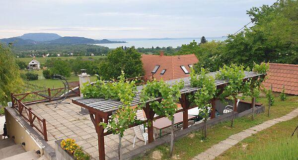 A házhoz 22 m2 fedett terasz kapcsolódik, a déli és keleti oldalon 2x1,5x5 méteres nyitott terasz van kiülőkkel ahonnan egyedi, csodálatos kilátás tárul elénk a Balatonra és a tanúhegyekre.
