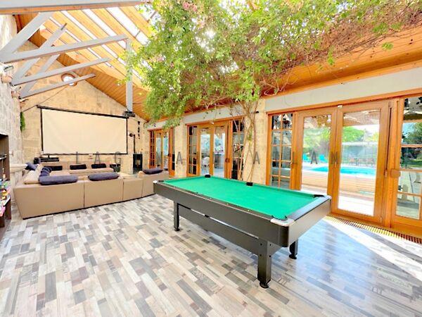 Nagy méretű medence és kertkapcsolatos terasz a medence körül, fedett terasz, provance-i stílusú borospince szintén kertkapcsolattal, télikert, ami moziteremként, illetve előadóteremként is használható. A parkban rendezvénysátor, függőágyak, napágyak.