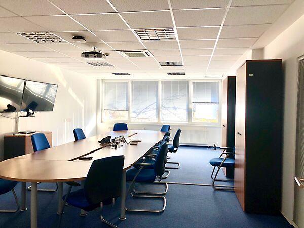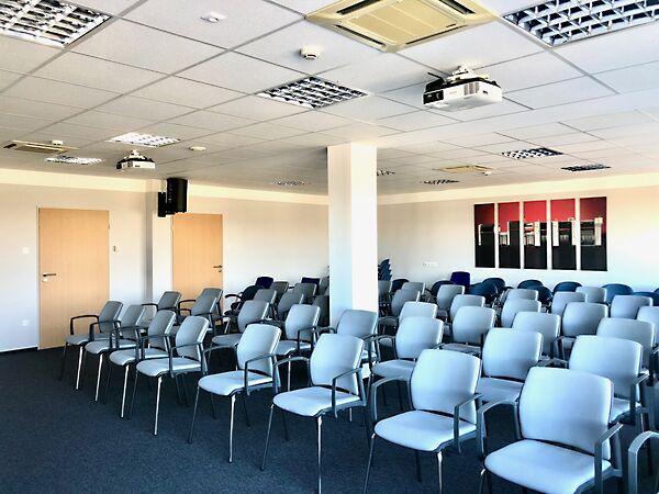 Az iroda épület 2 szintre tagolódik, közvetlenül a csarnok mellett helyezkefik el, így a csarnokba az átjárás közvetlenül biztosított. A földszint (222,44nm) helyiségei: szélfogó, porta rész, egy légterű iroda, lépcsőház. Az emelet (212,36 nm) helyiségei: közlekedő, 84 nm alapterületű konferencia terem, tárgyalók, szeparált mosdók, teakonyha. Az épület klimatizált.