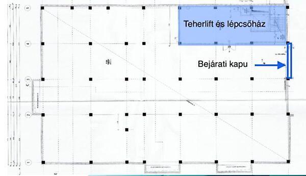 A raktárterületet az épület mélyszintjén található 2,6 m belmagasságú, tömbös tárolásra alkalmas.