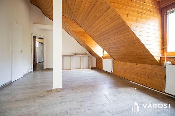 A közlekedőből nyíló 3 szoba, valamint a nappali-konyha laminált padlós, a tetőtéri ablakok fából vannak, a fűtése kombi gázkazánnal megoldott - radiátor hőleadókkal.