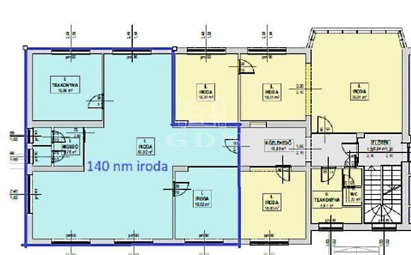 Az irodarész saját vizesblokkal illetve teakonyhával rendelkezik, lásd alaprajz.
