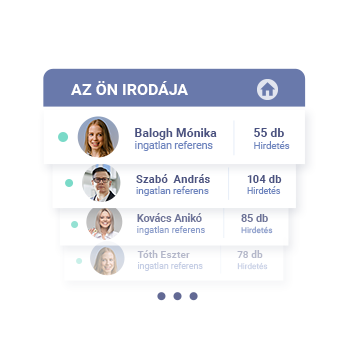 Egy iroda hirdetési portfóliója folyamatosan változik, szinte nincs két olyan munkatárs, aki azonos mennyiségű ingatlant hirdetne. Ezt mi is tudjuk, ezért az Ingatlannet.hu csomagjait úgy alakítottuk, hogy a lehető legrugalmasabb legyen. Nálunk nem kell referensenként új csomagot vásárolnod, helyette egyszerűen, díjmentesen hozzáadhatod az irodai csomaghoz az összes kollégád.